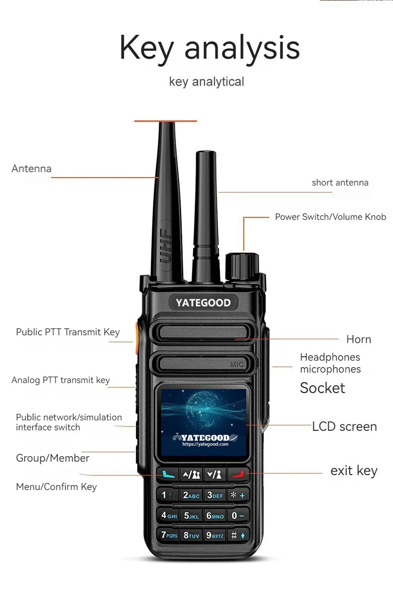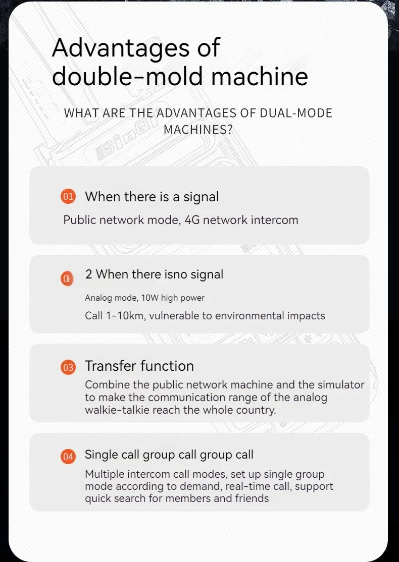 Features: 4G/3G/2G netwark free switching,anakog FM intercamurlimited distance,dual mode and dual switch