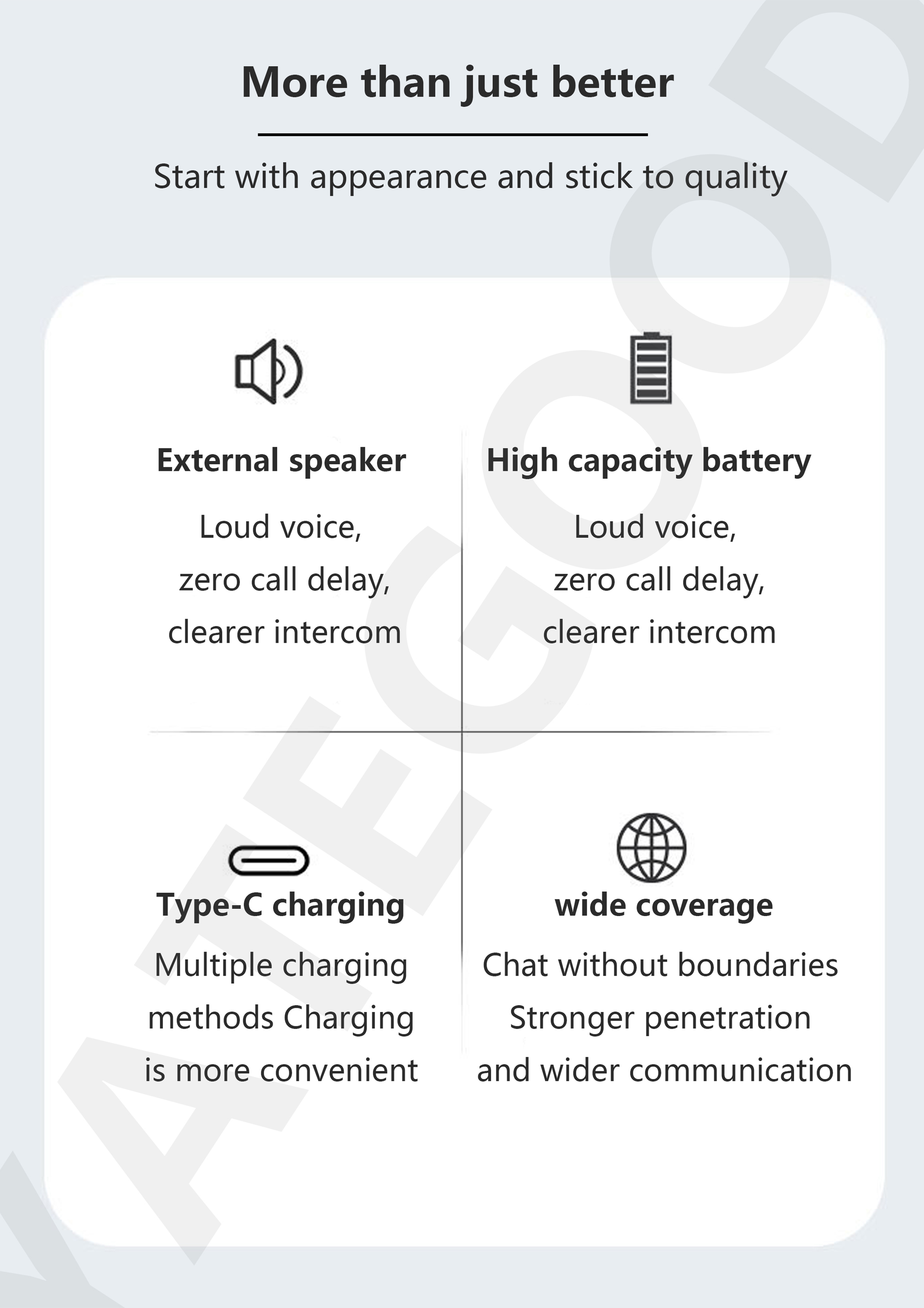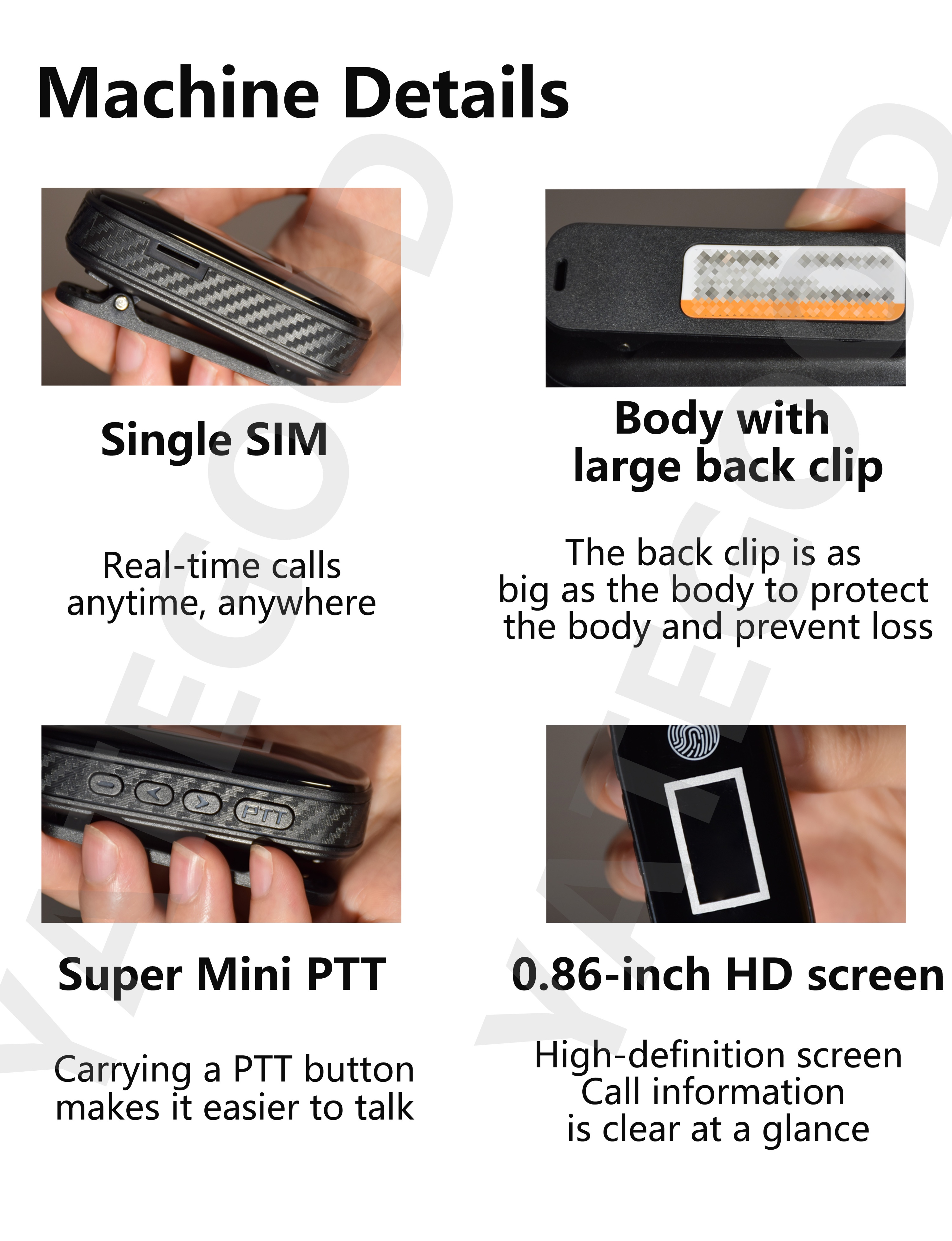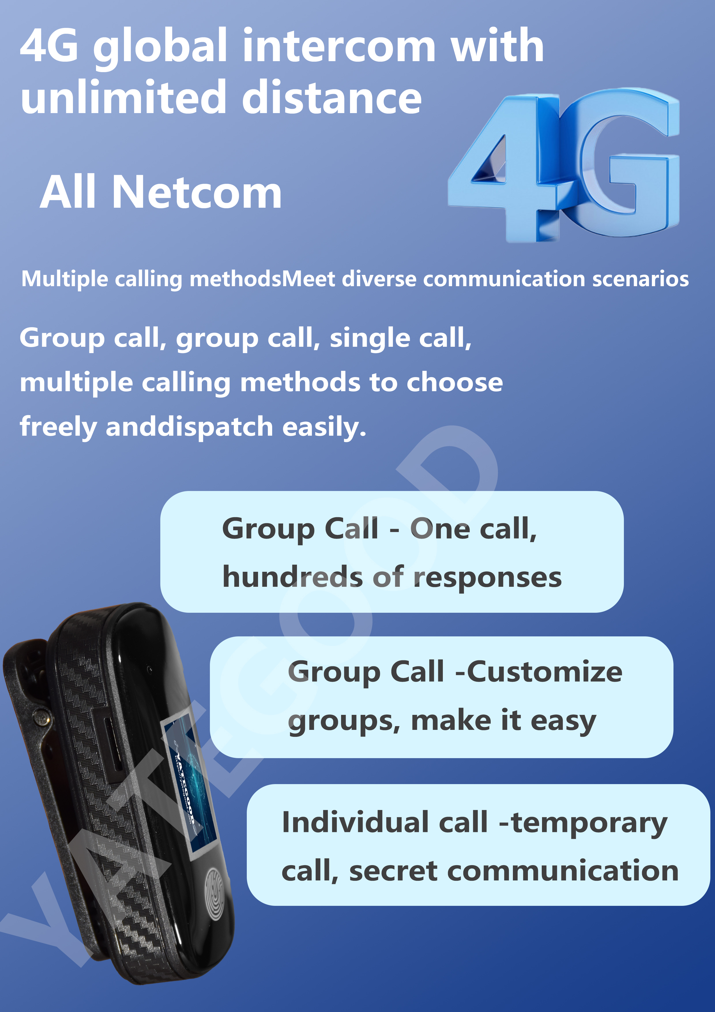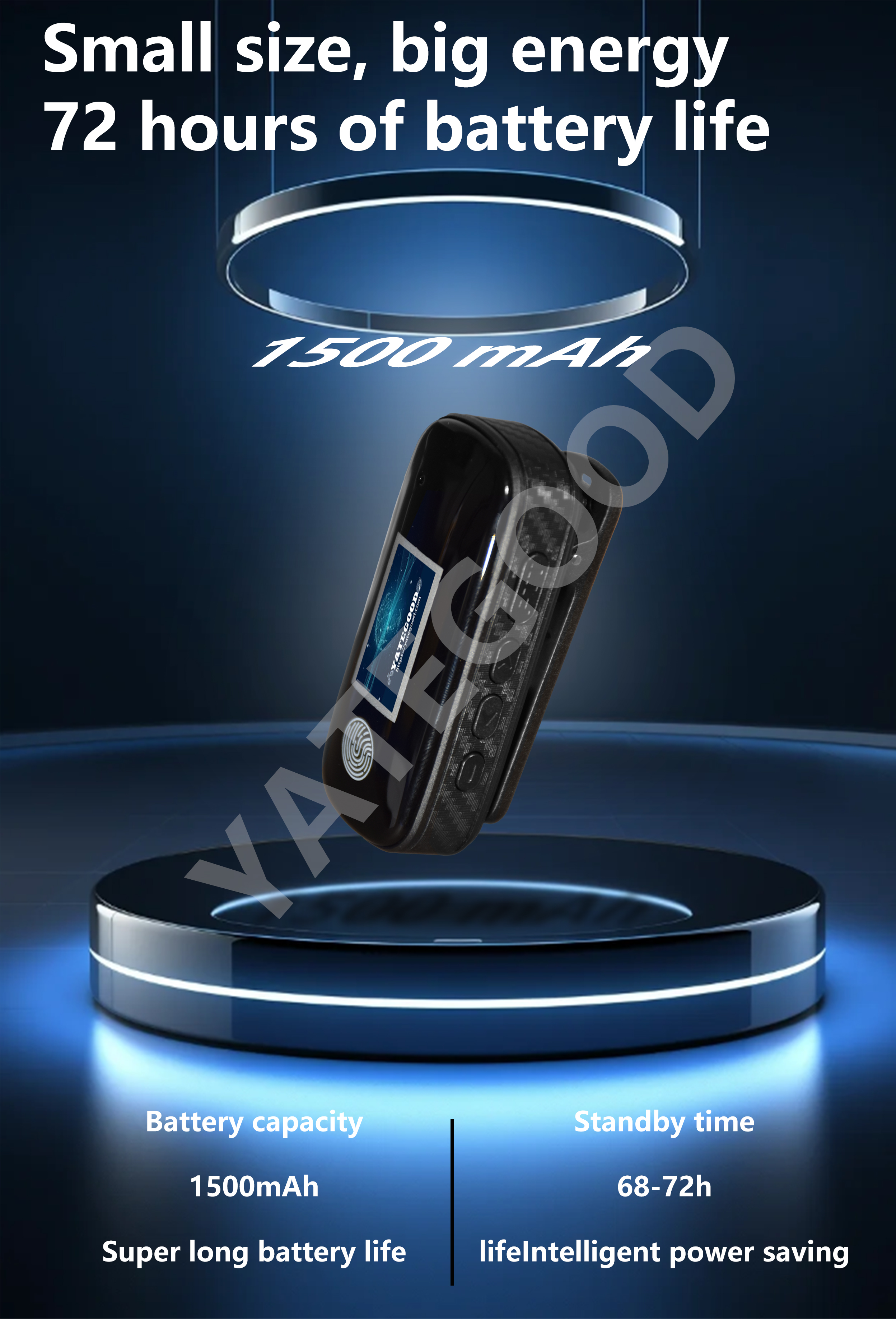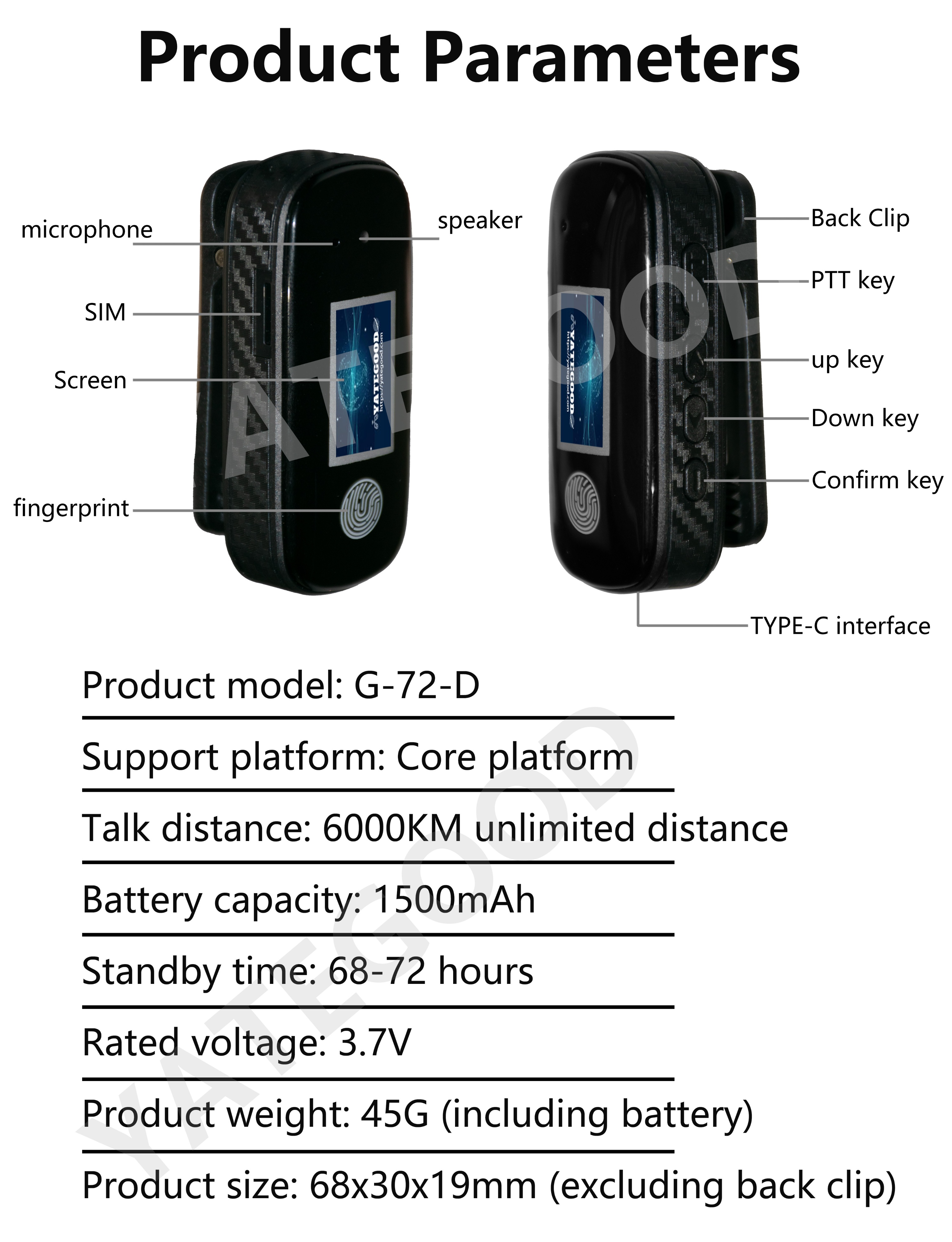 Product model:G-72-DSupport platform: Core platformTalk distance: 6000KM unlimited distanceBattery capacity: 1500mAh Standby time: 68-72 hoursRated voltage:3.7VProduct weight: 45G (including battery)Product size: 68x30x19mm(excludingback clip)